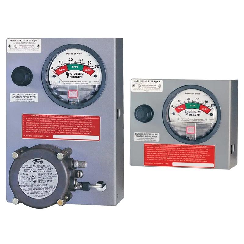 | 1001A 型設備是一種外殼加壓或吹掃系統,使用壓縮儀表空氣或惰性氣體作為供氣。此系統可調節並監測密封(防護)外殼內的壓力,以防止可燃粉塵積聚或清除並防止易燃氣體或蒸氣積聚。在 Class II 區域該系統維持「安全」(1.0 英吋)壓力。在 Class I 區域,該系統完成四次空氣交換並維持「安全」(0.25 英吋)壓力。這些過程會降低外殼內的危險(分類)區域等級,符合 NEC - NFPA 70 第 500 條、NFPA 496 和 ISA 12.4 的規定。 | |||